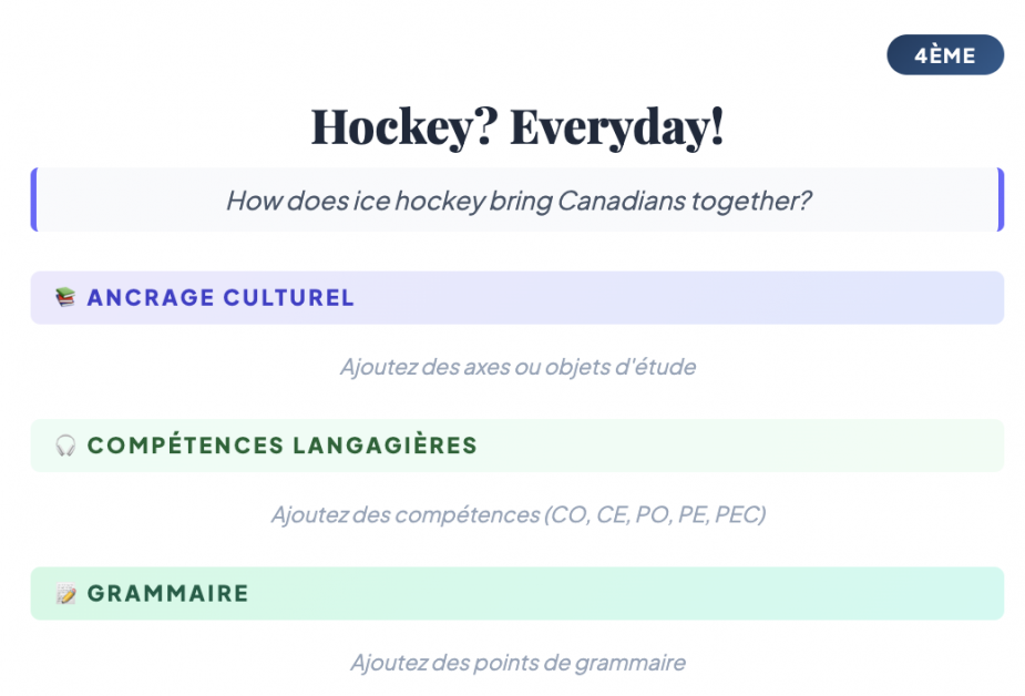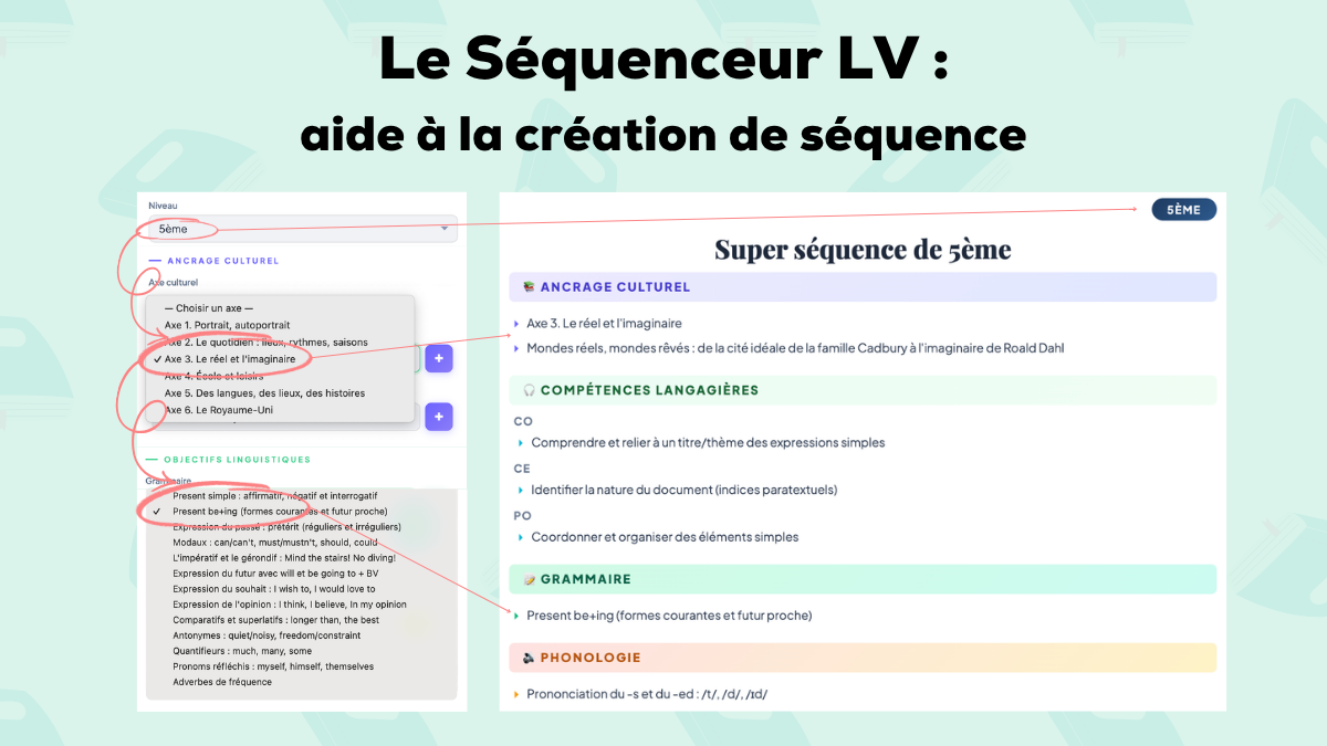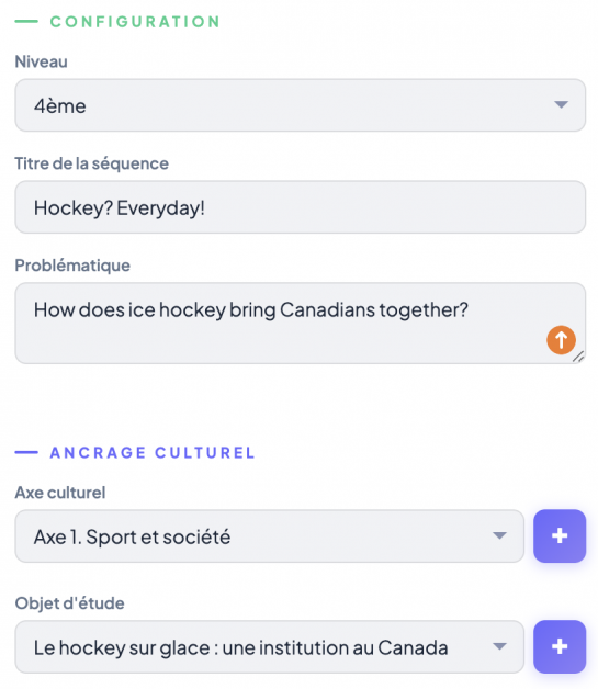 Le tout est dynamique donc si je choisis un niveau, Le Séquenceur va uniquement me proposer les axes, objets d’études et compétences et activités langagières de ce niveau dans la langue choisie. En cliquant sur le petit +, cela ajoute à la page de droite ce qui vous permet d’avoir un visuel que vous pouvez sélectionner puis ajouter sur votre document de séquence. Le tout pouvant être amélioré, si vous m’envoyez des demandes, j’essaierai d’y répondre au plus vite avec plaisir.